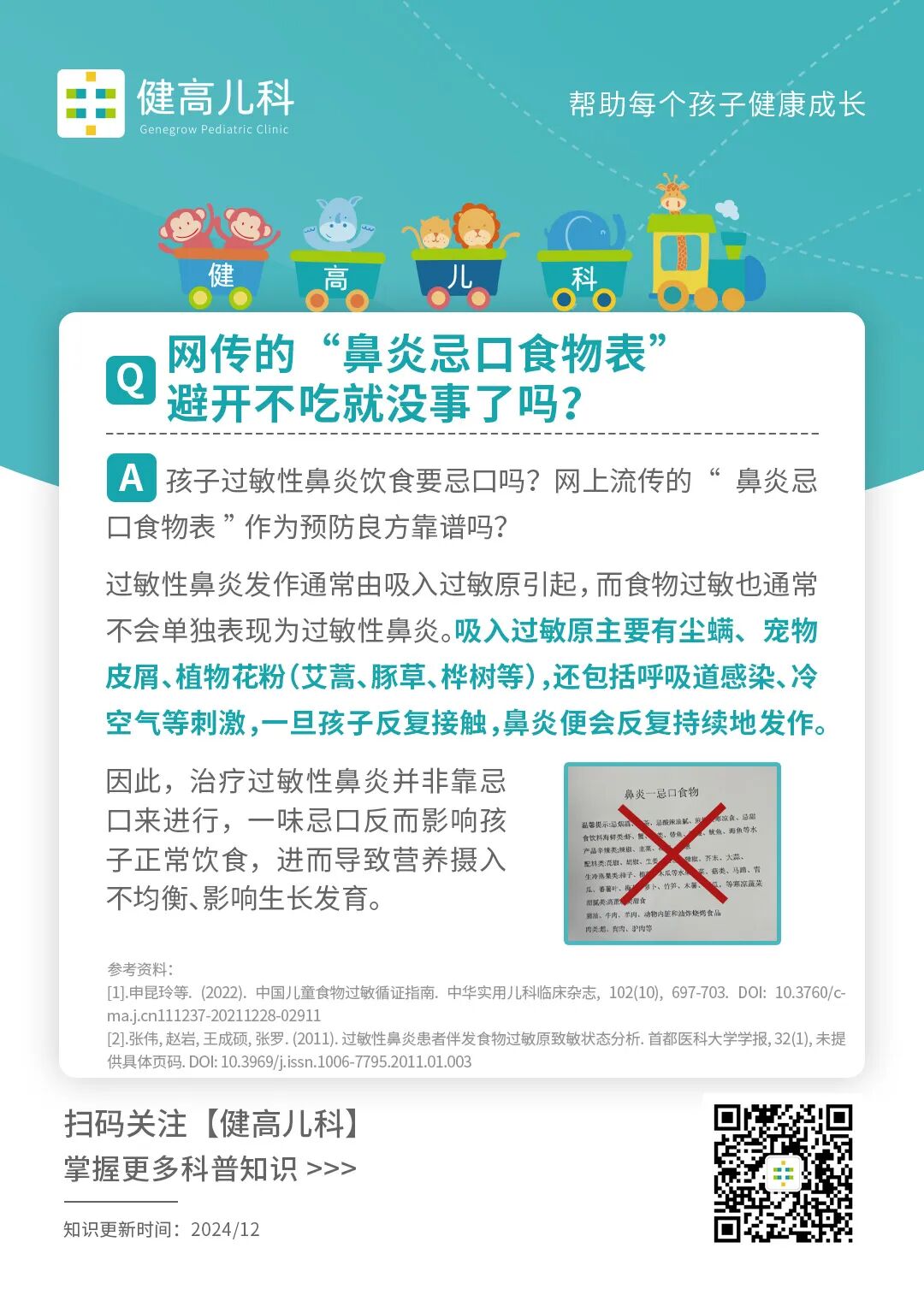 “鼻炎忌口食物表”在网上传开了!避开不吃就没事了吗? 2025年10月27日 分享: 【免责声明】本文数据更新于2024年12月。文章的目的是提供一般的医疗、健康、用药的科普信息,不能代替任何个人的医学诊断和治疗。个人的医学问题请及时咨询医生。对这篇科普文有任何建议,请给我们留言。新广告法说明:根据广告法等相关法律规定所有页面不得出现绝对性用语,健高儿科支持广告相关管理要求,为了不误导客户,页面明显区域已排查修改。根据广告法与市场监管部门指示,在此郑重声明:本平台所有页面上的绝对性用语在此声明前全部失效。如果图片表述、文字表述等因素使客户产生误导、歧义、联想的,请联系我们。