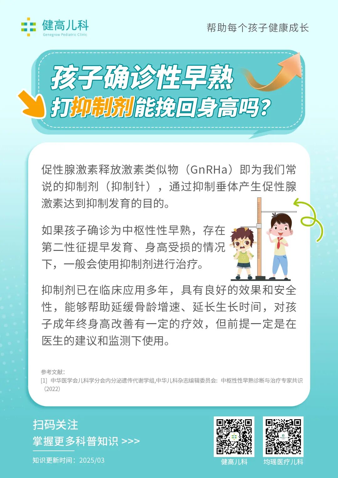 孩子确诊性早熟,打抑制剂能不能挽回身高? 2025年10月27日 分享: 【免责声明】本文数据更新于2025年3月。文章的目的是提供一般的医疗、健康、用药的科普信息,不能代替任何个人的医学诊断和治疗。个人的医学问题请及时咨询医生。对这篇科普文有任何建议,请给我们留言。新广告法说明:根据广告法等相关法律规定所有页面不得出现绝对性用语,健高儿科支持广告相关管理要求,为了不误导客户,页面明显区域已排查修改。根据广告法与市场监管部门指示,在此郑重声明:本平台所有页面上的绝对性用语在此声明前全部失效。如果图片表述、文字表述等因素使客户产生误导、歧义、联想的,请联系我们。